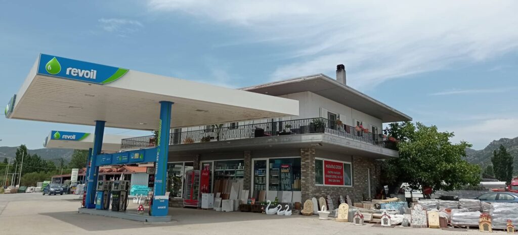 Πρατήριο υγρών καυσίμων REVOIL, βουλκανιζατέρ-λυπαντικά-ανταλακτικά δικύκλων, υλικά οικοδομών, χωματουργικά, διακοσμητικά κήπου, ζωοτροφές, ξυλεία, σιδερικά, υδραυλικά, χρώματα.